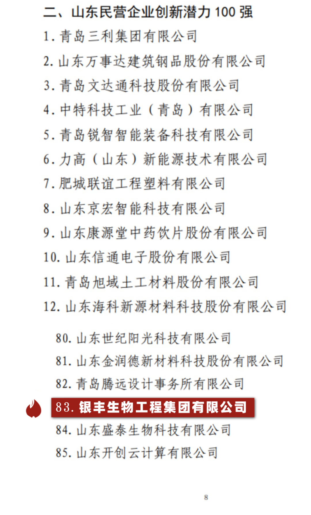 近日,为引导民营企业转型发展、更加注重创新,由省工商联、省科技厅、省工业和信息化厅、省人力资源和社会保障厅、省农业农村厅、省商务厅、省税务局、省市场监管局共同开展的2022年山东民营企业100强系列榜单活动发布公示名单,上榜企业是山东民营企业创新发展的代表、标杆,银丰生物集团入选2022年山东民营企业创新潜力100强。