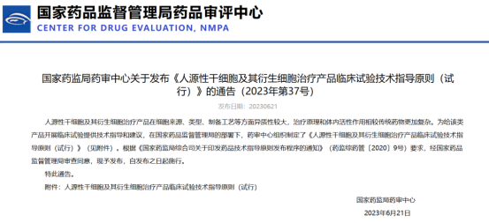 6月21日,国家药监局药审中心发布《人源性干细胞及其衍生细胞治疗产品临床试验技术指导原则(试行)》的通告。