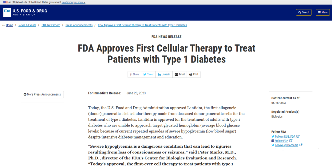 据报道,这是全球获批上市的首款由胰腺细胞制成的同种异体胰岛细胞疗法。FDA生物制品评估和研究中心主任Peter Marks博士表示:“严重低血糖是一种危险的病症,可能导致意识丧失或癫痫发作,Lantidra的获批上市是有史以来第一个治疗1型糖尿病的细胞疗法,为患有1型糖尿病和反复严重低血糖的患者提供了一种更优的治疗选择。”